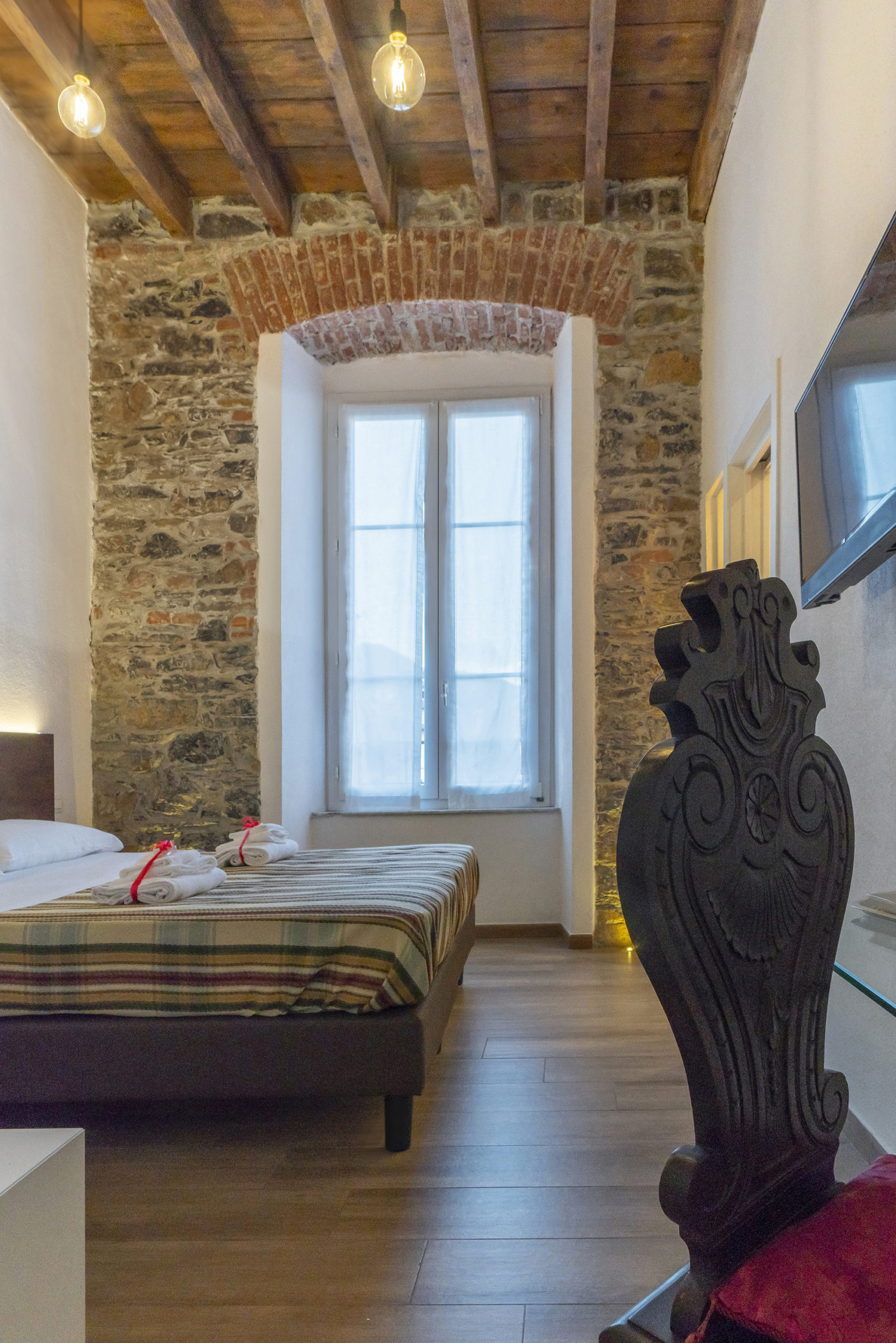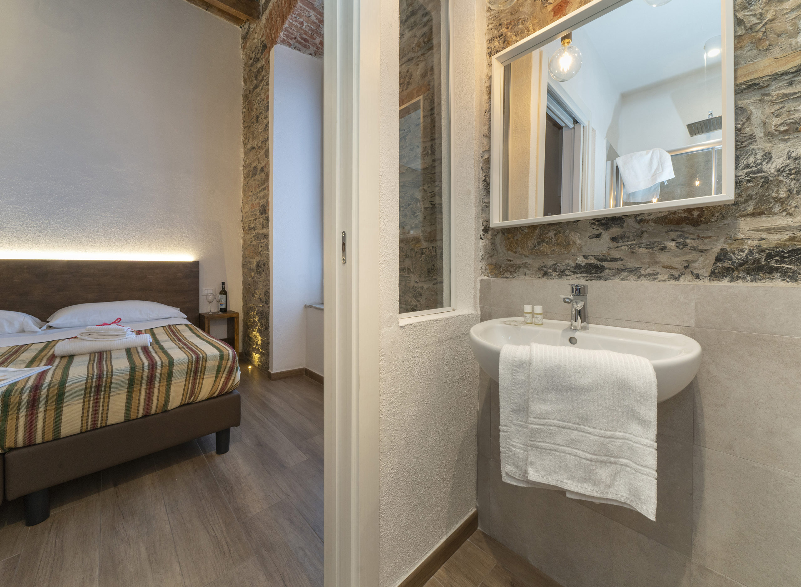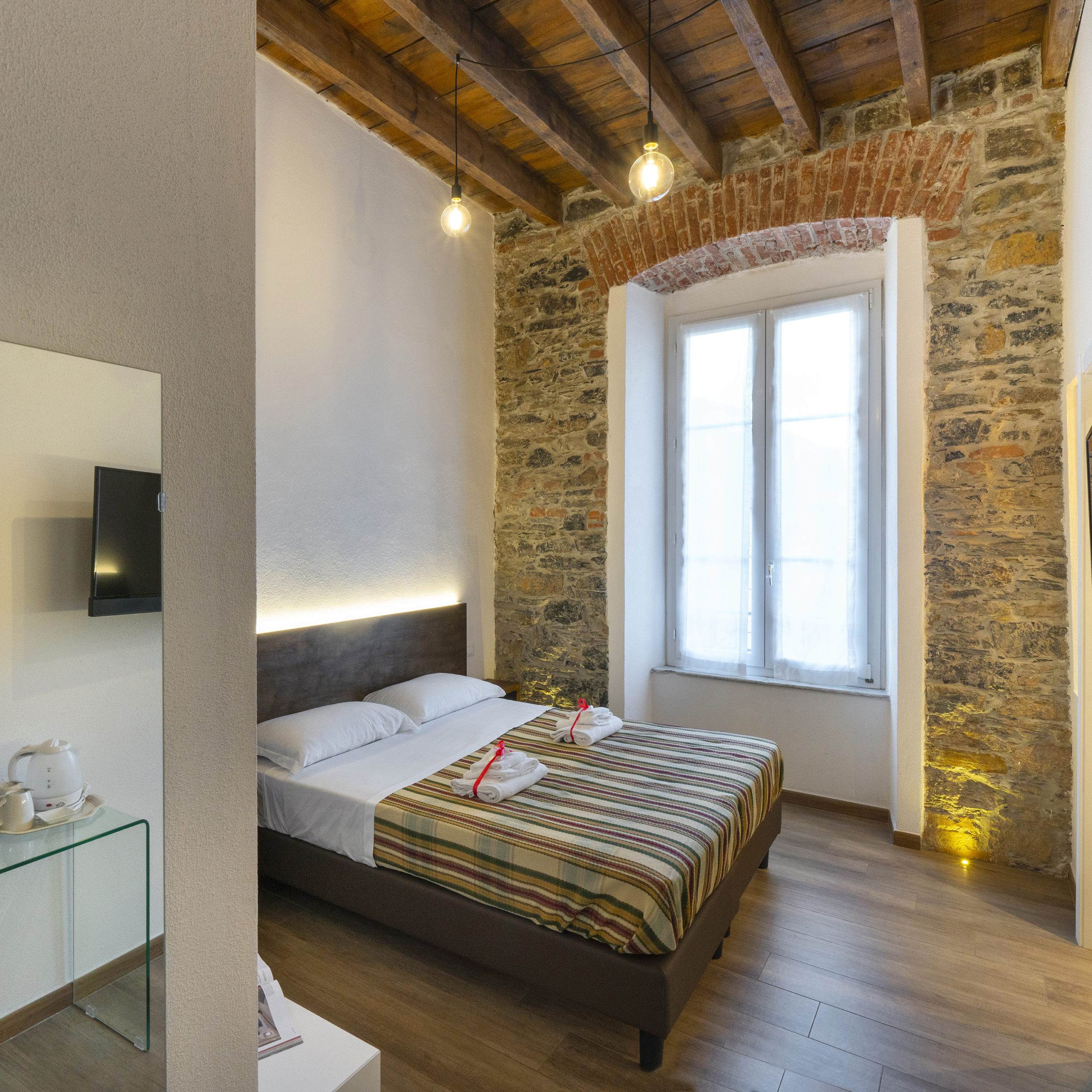 Dentro, la camera è esattamente quello che promette: genuina, luminosa, curata senza eccessi. La pietra a vista illuminata dal basso dialoga con le pareti bianche in un equilibrio che non stanca. L’arco in mattoni incornicia la finestra come un dipinto, e la luce che entra la mattina riempie ogni angolo.