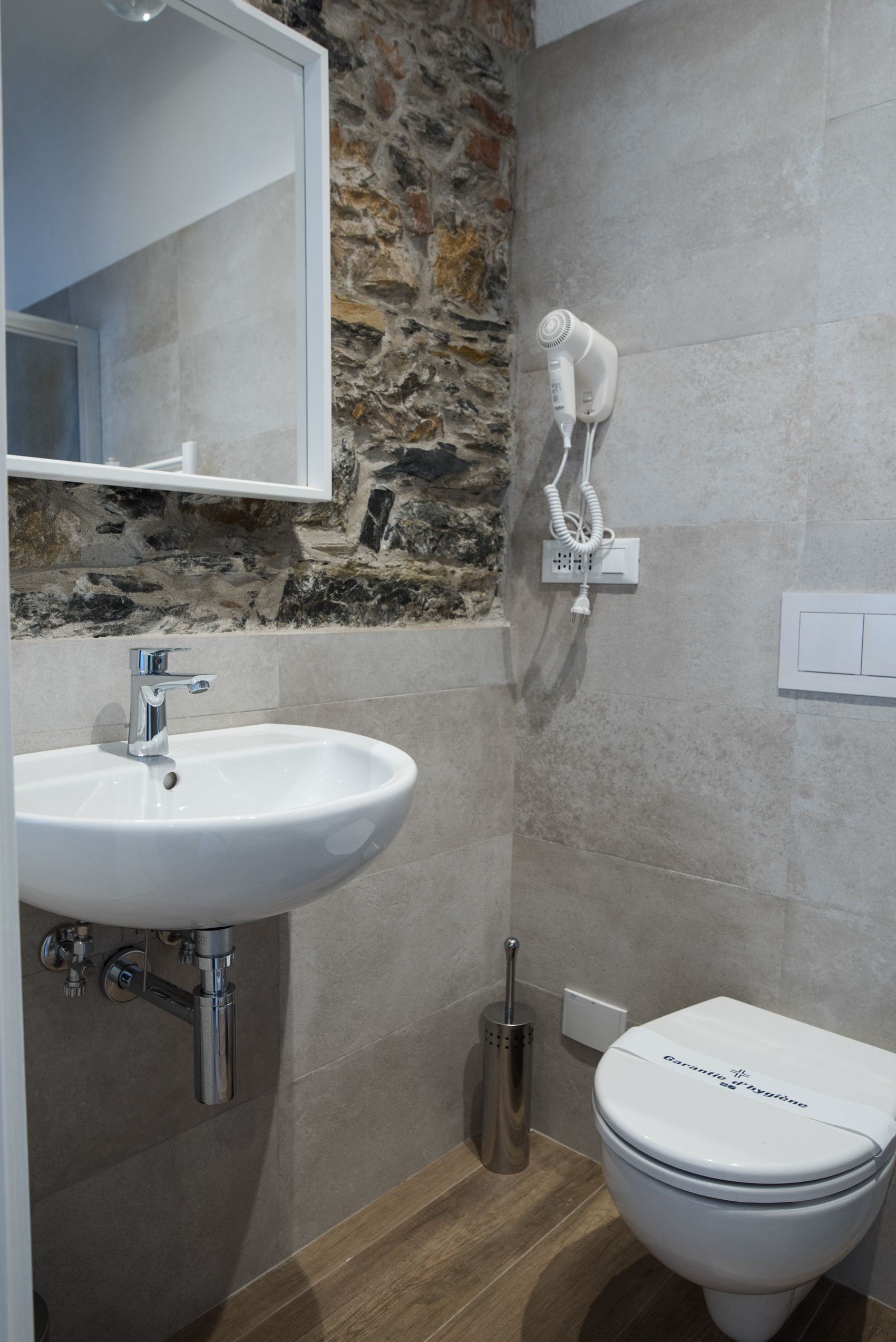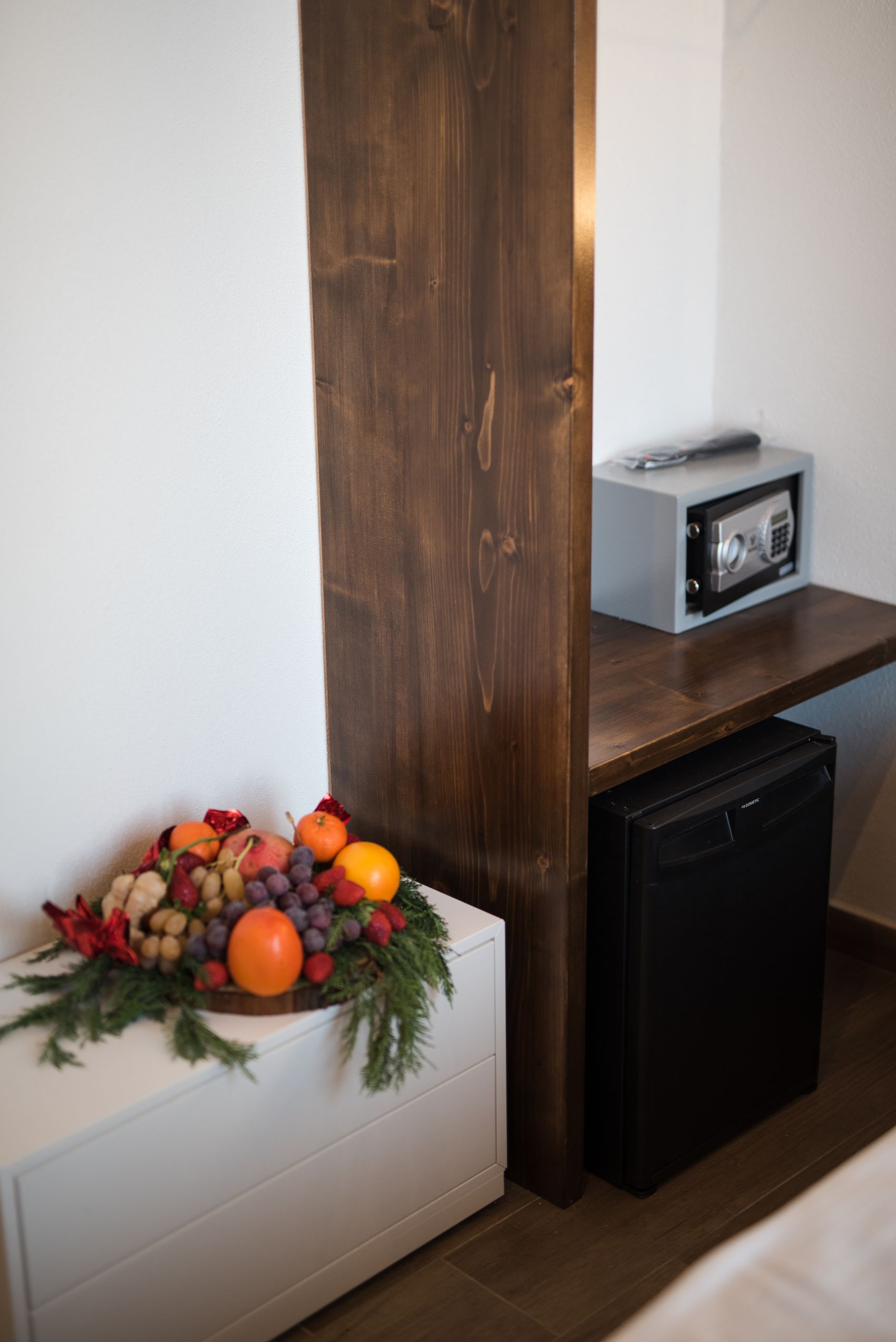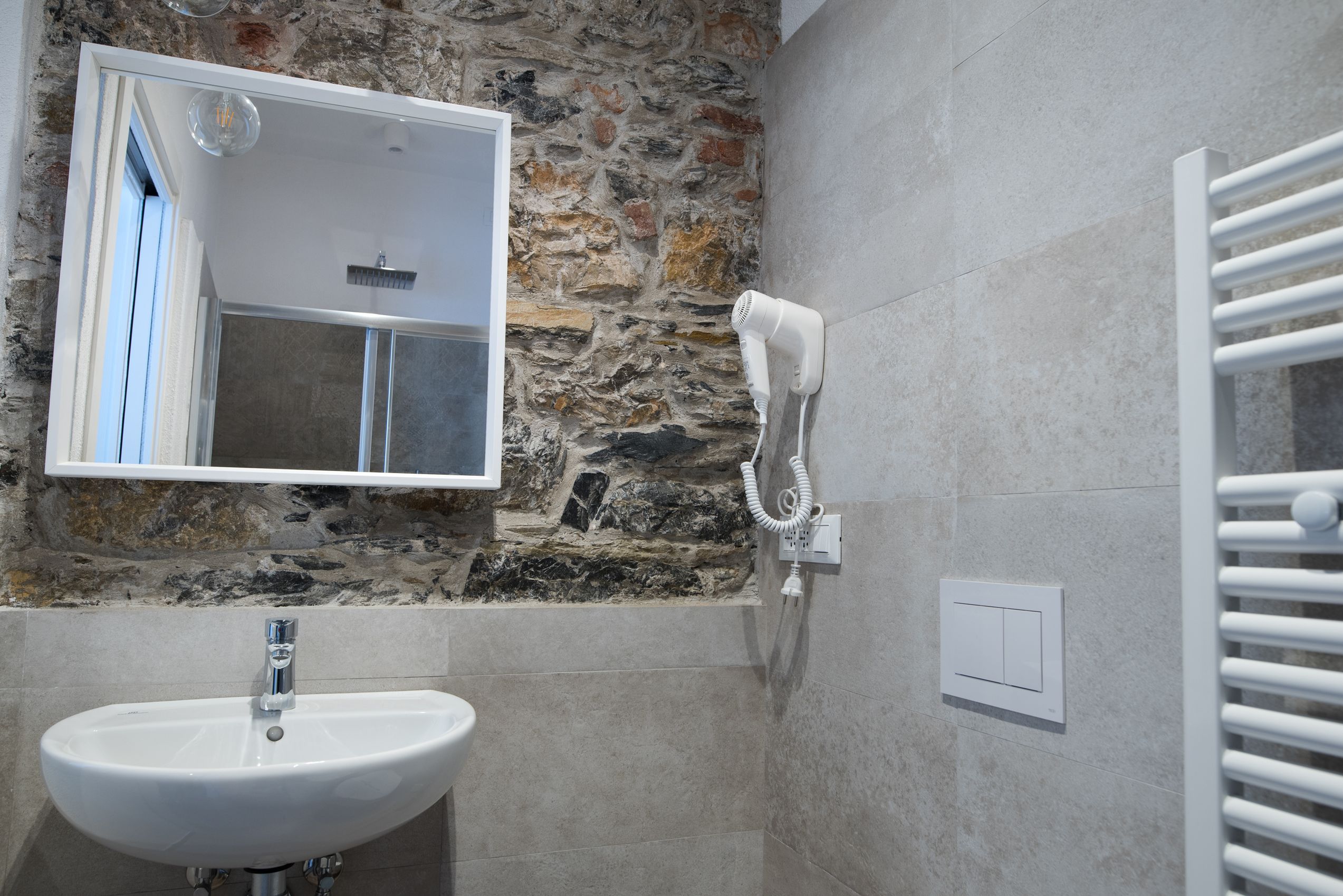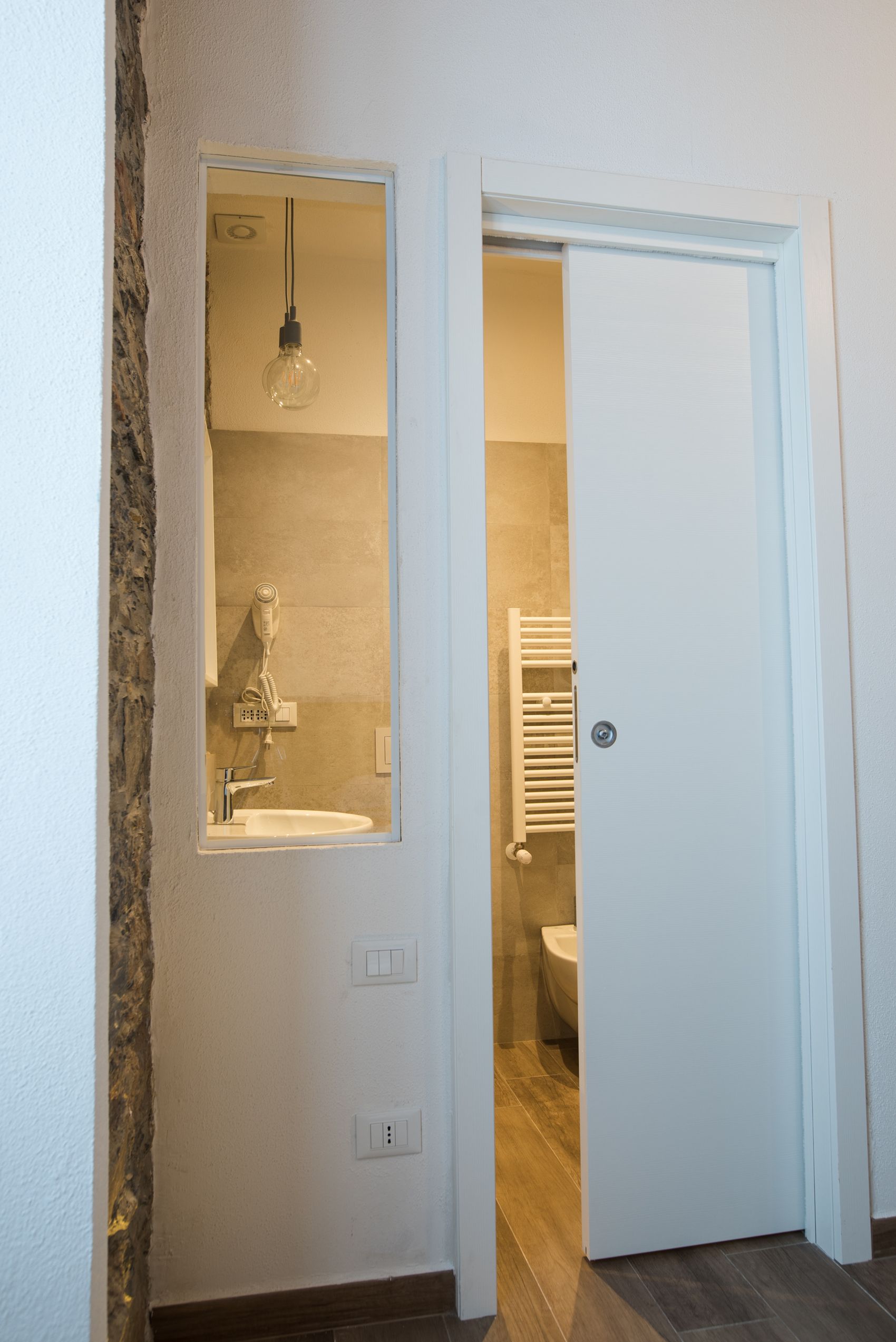 Dentro, la camera è esattamente quello che promette: genuina, luminosa, curata senza eccessi. La pietra a vista illuminata dal basso dialoga con le pareti bianche in un equilibrio che non stanca. L’arco in mattoni incornicia la finestra come un dipinto, e la luce che entra la mattina riempie ogni angolo.