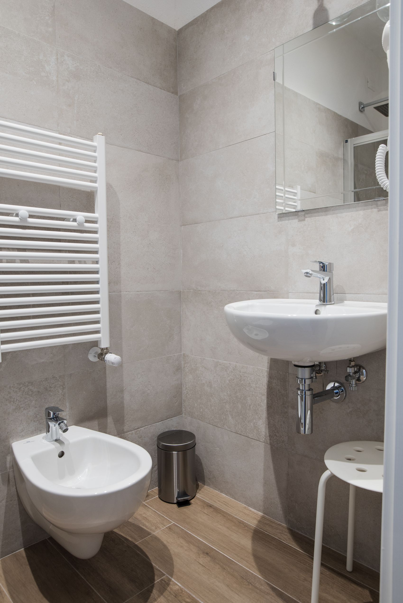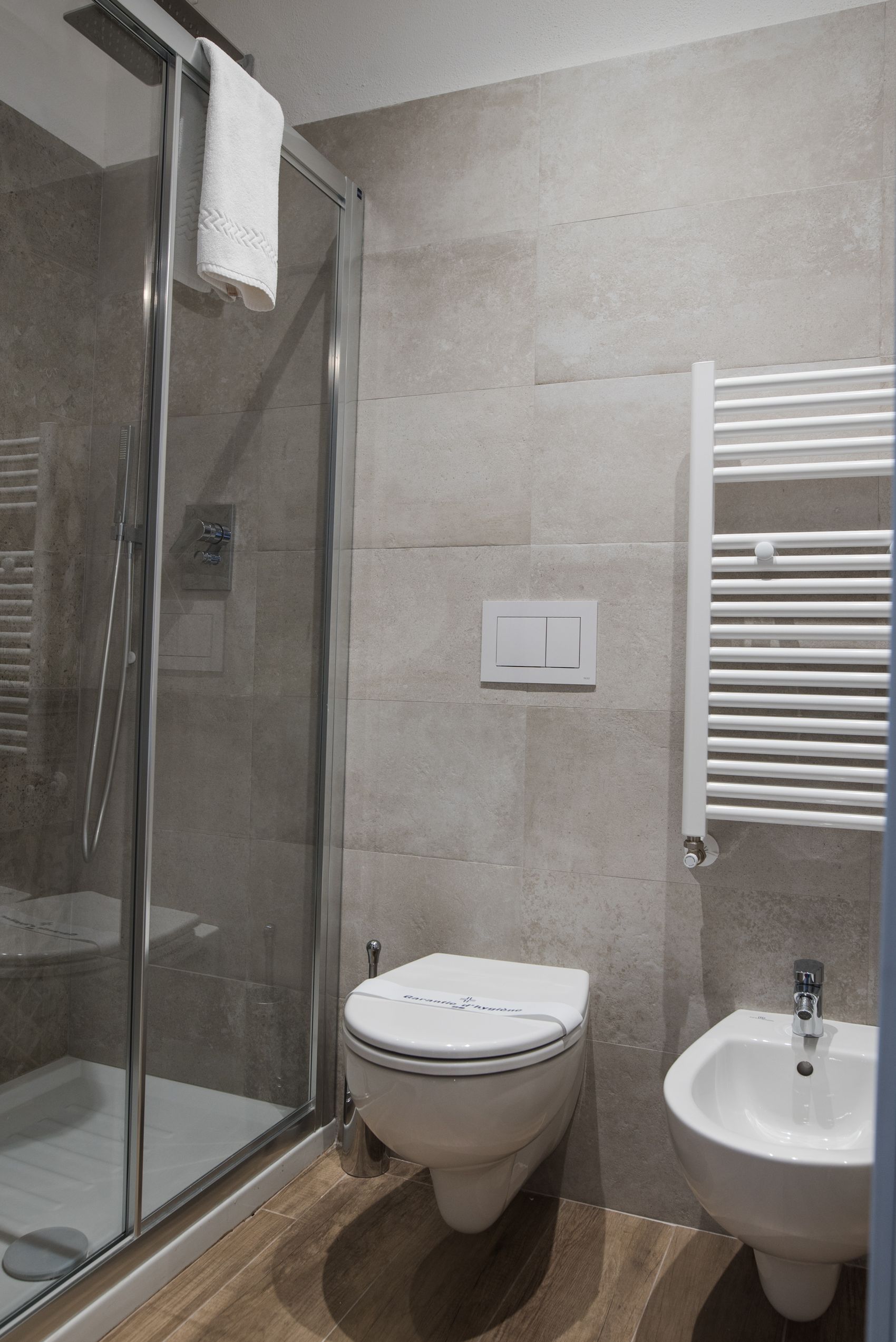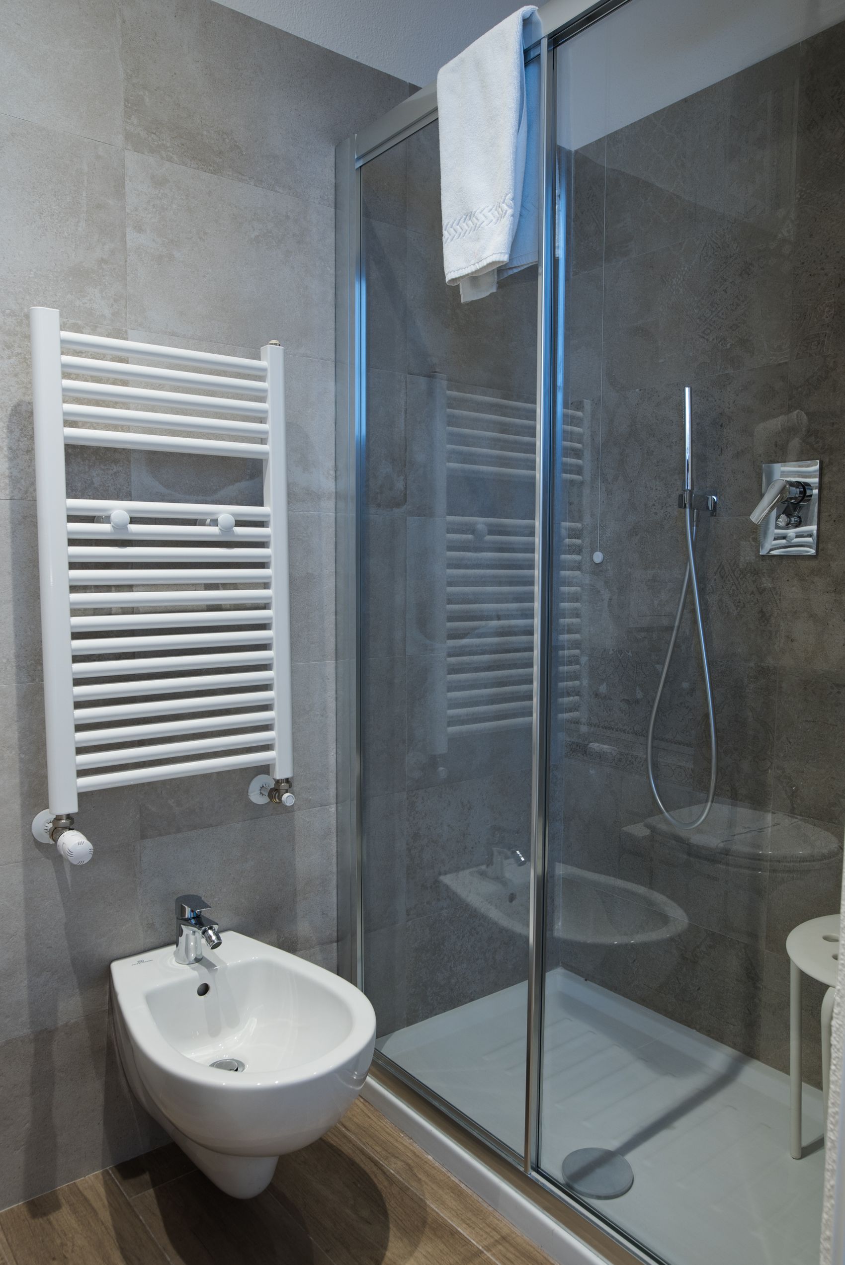 Il letto queen size con topper anallergico è morbido e silenzioso. La vista sui tetti e le colline di La Spezia ti accompagna dall’alba. Il bagno privato è moderno e funzionale: doccia con luce cromatica, scaldasalviette, set di cortesia completo. Climatizzazione autonoma, WiFi gratuito, cassaforte, scrivania e prese internazionali: tutto quello che serve, niente di superfluo.