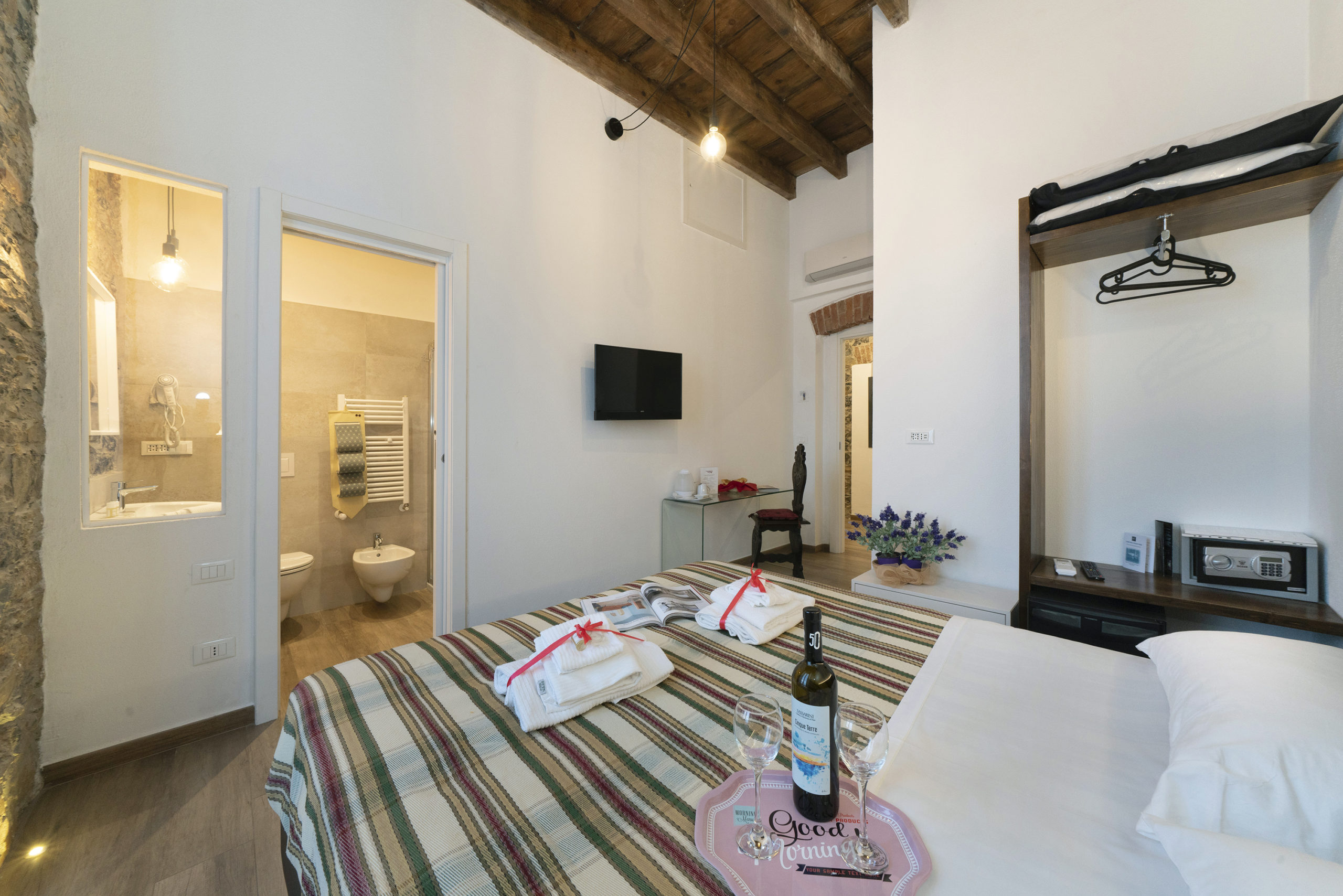 Camera Deluxe con letto Queen size e doccia con punto luce cromoterapia, particolarmente luminosa, indicata per coppie, con vista città su palazzi storici e colline.